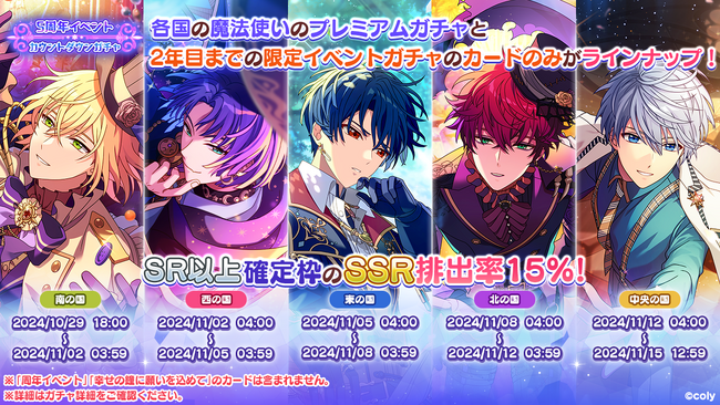 各国の魔法使いのプレミアムガチャのカードと2年目までの限定イベントのガチャで登場したカードがラインナップされたガチャを開催!