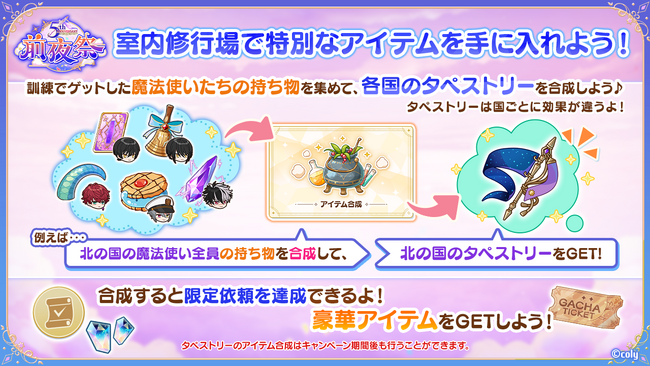 訓練でゲットした『魔法使いたちの持ち物』を室内修行場で合成すると各国のタペストリーに!