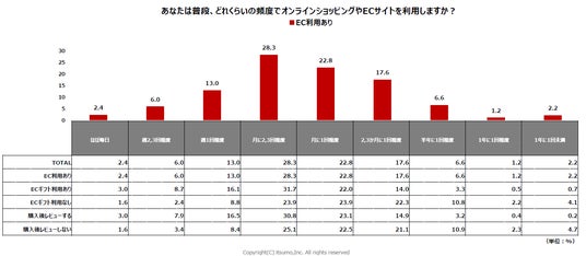 ・EC利用の頻度は月に1~3回程度という方が約半数。週に1回以上利用する人は約2割。