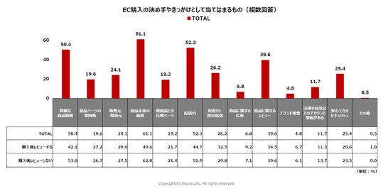 ・ECでは、「価格」「配送料」などのコスト面でのほか、「商品説明がわかりやすいこと」や「レビュー」「セキュリティ」など失敗などの不安を払拭できる”安心感”が購入の決め手となる。
