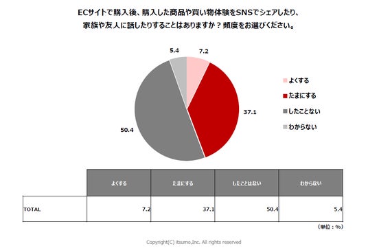 ・EC購入後に買い物体験をSNSでシェアしたり、家族友人に話す人は「よくする」「たまにする」合わせて44.3%。