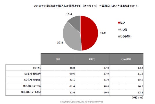 ・実店舗で購入した商品をECで再購入したことがある人は、全体の約半数と多い。