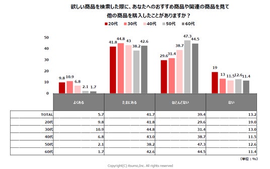 ・中でも「20代」は51.6%、「30代」は55.7%と、半数以上がおすすめ商品や関連商品からの商品購入経験がある。