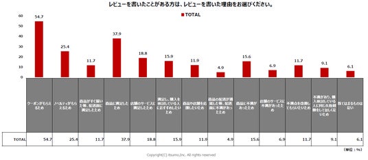 ・レビュー記入の理由は「クーポンがもらえるため」が最も多く、次に「商品に満足したため」という結果から、レビューを増やすためにはインセンティブや顧客満足度を高める取り組みが重要。