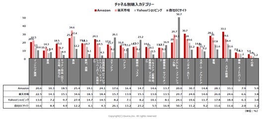 ・Amazonでよく購入されるカテゴリーは「PC・スマホ関連製品」や「家電」、楽天市場は「食品」や「アパレル・ファッション小物」。