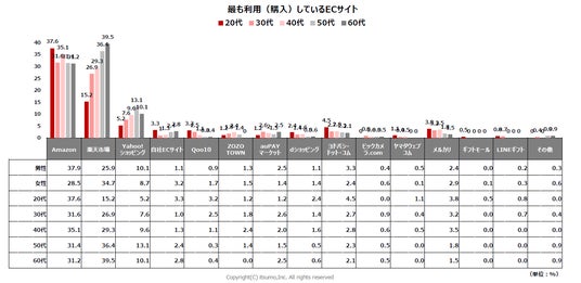 ・「最も利用するECサイト」は、全体傾向としてはAmazonと楽天市場に二極化している
