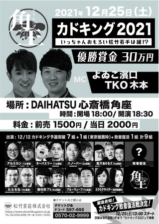 松竹のいっちゃんおもろい若手を決める大会「カドキング」をMCよゐこ濱口、TKO木本をむかえ12月25日(土)にDAIHATSU 心斎橋角座で今年も開催致します!