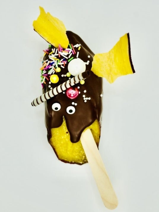 蜜芋研究所/yumyumオイモンスター:900円蜜芋研究所が厳選した焼き芋をチョコバナナ風にアレンジしました。甘い冷やし焼き芋にチョコソース、カラフルなトッピング、目玉キャンディーでモンスターを再現しました。写真映えする新しいさつまいもスイーツです。チョコ、ホワイトチョコ、ストロベリーチョコの3つの味をご用意!