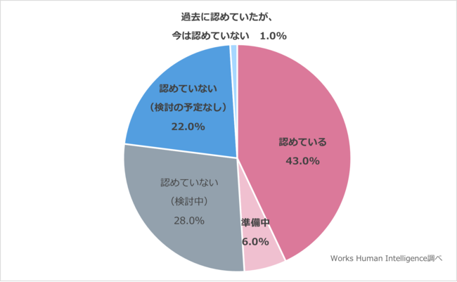 1. 副業を「認めている・準備中」と回答した企業が全体の約半数を占める一方、「認めていない(検討の予定なし)・過去に認めていたが、今は認めていない」と回答した企業は全体の23.0%という結果になりました。