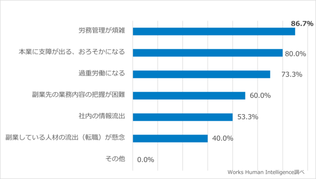 その他自由回答では、「他社に雇用される形式の副業を現状認めていないが、今後認めることになると合算の就労管理が一番の課題」「副業先の労働条件の方が当社よりも良い場合の当社での勤務時間減または退職のリスクが不安」といった課題も挙げられました。