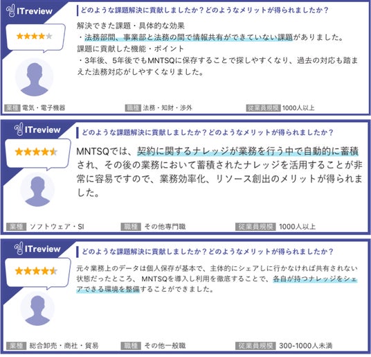 「Leader」とは、顧客満足度と市場認知度の双方において最高水準を満たす製品に与えられる称号です。国内外のITプロダクトが対象となるなか、ユーザーの実声に基づく評価で3期連続の最高位受賞は、MNTSQ CLMに対するエンタープライズ企業様からの、継続的な高い信頼の証明です。