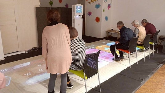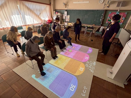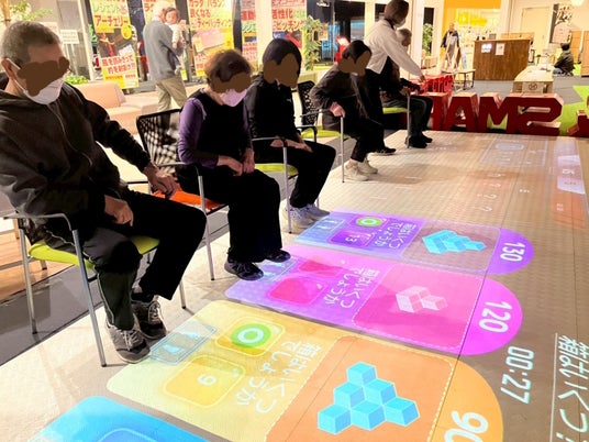 ・活用デジタルデバイス:床投影型の体育DXデバイス「フロアピック」を使った椅子に座りながら、足を使って操作するデジタルプレイ環境