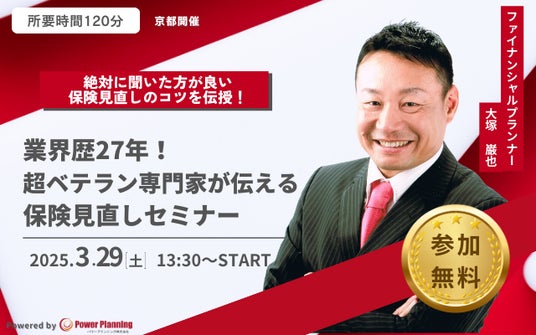 3月29日(土)13時30分より人気講師、大塚巌也氏による「【絶対に聞いた方が良い保険見直しのコツ伝授】業界歴27年の超ベテラン専門家が伝える保険見直しセミナー」を開催いたします。