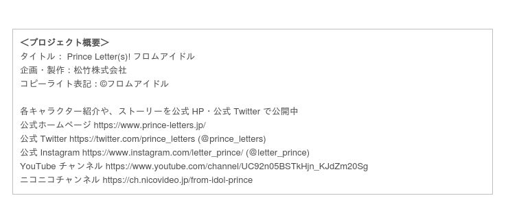 松竹株式会社が展開する文通もできる二次元アイドルプロジェクト『Prince Letter(s)! フロムアイドル』 (通称プリエル)。