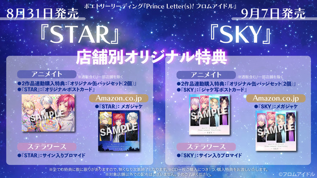 1 枚目は 8 月 31 日発売の「亜月アキトの話」など初期のポエトリーリーディング楽曲をまとめた 「ポエトリーリーディング『Prince Letter(s)! フロムアイドル』-STAR- 。