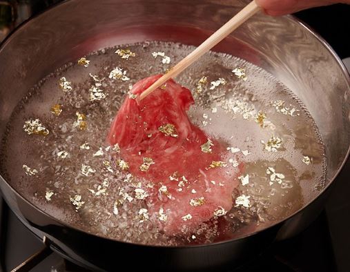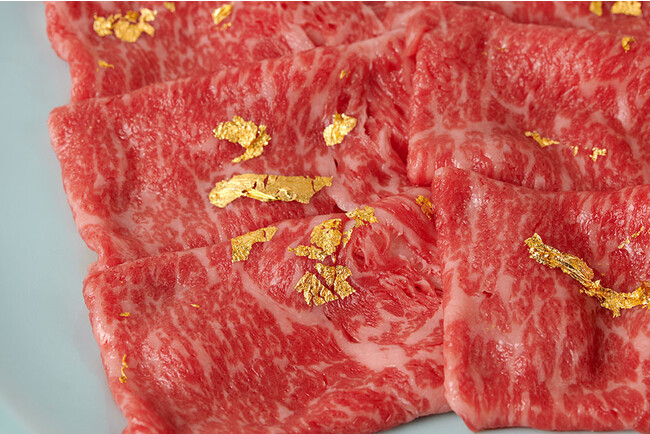 ふわりとゆらめく黄金色の金箔に、最上級のお肉をまとまわせる贅沢さ!