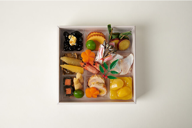 黒豆、田作り、松前漬け、数の子、紅白なます、小鯛酢漬け、竹の子含め煮、小柚昆布巻き、海老艶煮、赤魚西京焼き、丸十蜜煮、若桃甘露煮、笹麩、彩り豆、鶏けんちん焼、きんとん、栗甘露煮、伊達巻、梅人参。