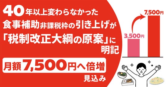 飲食店、食事補助支給企業、食事補助サービス事業者、あわせて1,140者・社で構成される「食事補助上限枠緩和を促進する会」(幹事社:株式会社エデンレッドジャパン)は、政府・与党の自民党が2025年12月19日(金)に公表した「令和8年度与党税制改正大綱」において、食事支給に係る所得税非課税上限が現行の月額3,500円から7,500円に引き上げ(※)と明記されたことをお知らせします。これは約40年ぶりの見直しとなります。