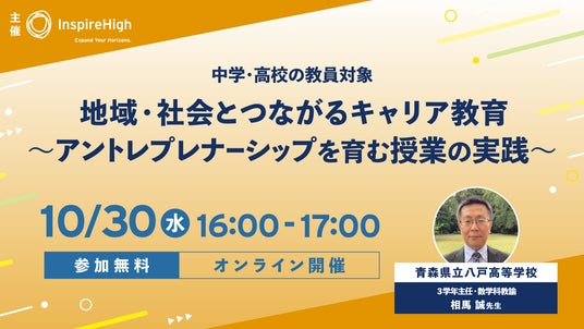 「世界とつながる探究的な学びを手軽に教室で」をコンセプトとしたEdTech教材を提供する株式会社Inspire High(本社:東京都千代田区、代表:杉浦太一)は、キャリア教育・アントレプレナーシップ教育の実践例を紹介する、中高教員向けのオンラインセミナーを10/30(水)に開催します。