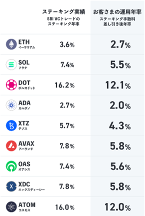 今回、入出庫サービスを開始する2銘柄は、いずれもステーキングサービスの対象銘柄となっております。これにより、当社で入出庫可能かつステーキングサービス対象である銘柄数は8銘柄となります。これらの銘柄については、SBI VCトレード以外で保有し、当社に入庫したものについても入庫日からステーキング対象になり、翌月にステーキング報酬が付与されます。