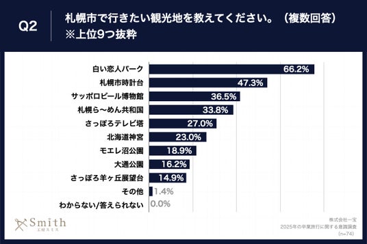 Q1で「札幌市」と回答した方に、「Q2.札幌市で行きたい観光地を教えてください。(複数回答)」(n=74)と質問したところ、「白い恋人パーク」が66.2%、「札幌市時計台」が47.3%、「サッポロビール博物館」が36.5%という回答となりました。