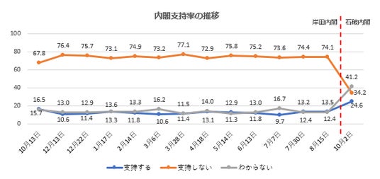 内閣を「支持する」24.6%、「支持しない」34.2%、「わからない」41.2%となった。支持するとした人を支持政党別に見ると、自由民主党では5割台後半となる一方、支持する政党がないとする無党派層は1割台半ば。公明党は3割台後半だった。