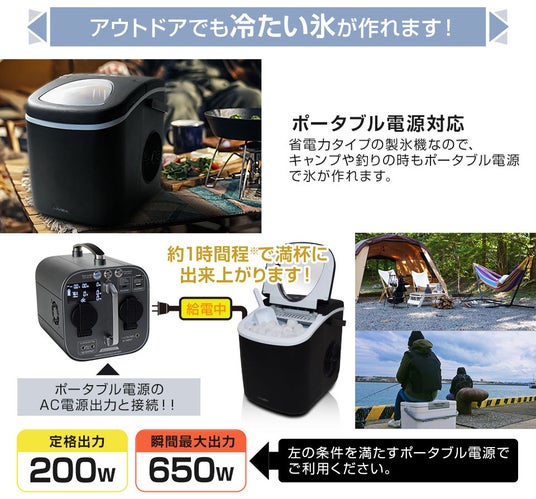 省電力タイプの製氷機なので、ポータブルバッテリーでも氷が作れます。