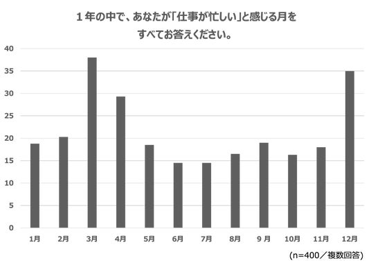 回答者の3割以上の人が日常的にオンオフの切り替えができておらず、特に3月、4月、12月といった繁忙期にはその困難さが顕著になる傾向があります。