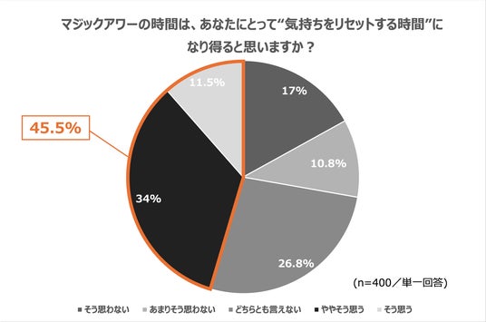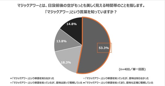 「マジックアワー」という言葉の認知度を調査したところ、「知らない」と回答した人は53.3%と過半数を占めました。一方で「マジックアワーの時間は、自身にとって“気持ちをリセットする時間”になり得ると思いますか?」という問いに対して、45.5%のおよそ半数の人が「そう思う」または「ややそう思う」と回答し、マジックアワーの時間帯に「気持ちのリセット効果」を感じていることが明らかになりました。このことから、言葉の認知度に左右されることなく、本能的な癒やし効果への共感が存在すると考えられます。