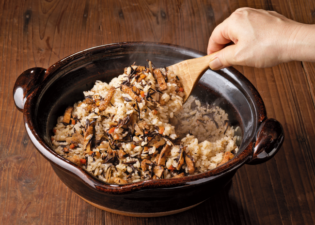 茅乃舎では、素材の味や風味を大切にした‘’御飯の素‘’シリーズを展開しています。ご飯に混ぜるだけ、炊き込むだけの手軽さで人気のシリーズです。今回新発売の「炊き込み御飯の素 ひじき五目」は、ひじきのふっくらとした食感を生かしています。他にも、鶏肉、ごぼう、油揚げ、にんじんを加え、うまみ豊かな炊き込み御飯の素に仕上げました。炊き立てはもちろん、冷めても美味しいので、これから秋にかけての新米の季節におすすめの逸品です。