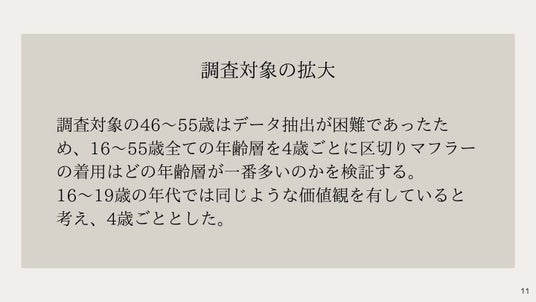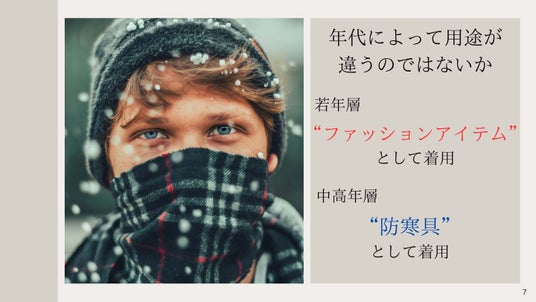 この授業内で、学生が実際に企画・データ分析した成果から、特に優秀と評価したレポートをシリーズで公開します。2025年第3弾のテーマは「マフラーの着用率はどの年代が一番多いのか?」。