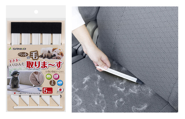 今回のイチオシ商品『ペットの毛取りま~す すきま用』は、布ソファーなどの手が届きにくいすきまに入って、毛をとることができます。コンパクトなので、お出かけの際にも1本持っておくと便利です♪