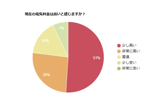 現在の電気料金について尋ねたところ、「少し高い」51%、「非常に高い」26%と、合計77%の人が電気代に対して高いと感じていることが分かりました。この結果から、多くの人が電気料金の見直しや節約方法に関心を持っている可能性が高いと言えるでしょう。