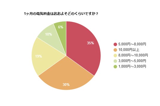 1ヶ月の電気料金について聞いたところ、「5,000円~8,000円」が最も多く35%、次いで「10,000円以上」が30%という結果になりました。また、「8,000円~10,000円」と回答した人も19%おり、全体の半数以上が月8,000円以上の電気代を支払っていることが分かりました。