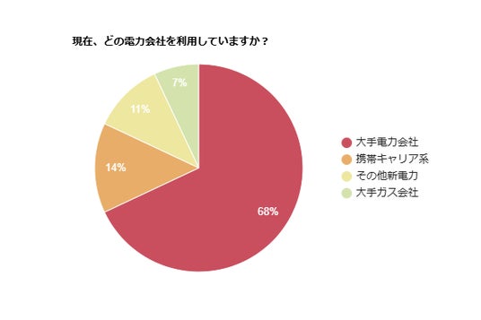 現在利用している電力会社について調査したところ、「大手電力会社」を利用していると回答した人が約68%と最も多く、依然として高いシェアを維持していることが明らかになりました。
