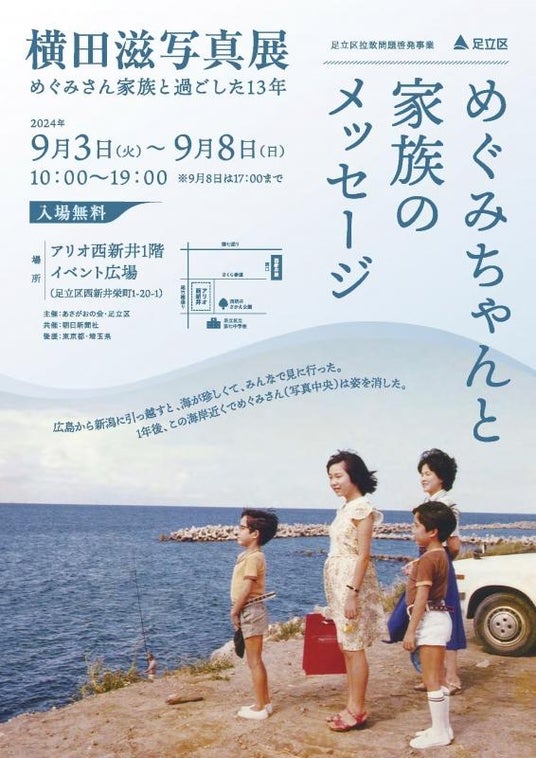 東京23区北東部で初開催となる本展は、全国に先駆け拉致問題等啓発推進条例を施行し啓発事業に取組む足立区と、横田滋さん・早紀江さんご夫妻の活動をサポートし、拉致被害者救出に向けて活動を続ける「あさがおの会」との共催で実現しました。滋さんが生前に撮影した、めぐみさんの成長の記録や家族の写真約70点や横田夫妻によるメッセージ動画の放映に加え、北朝鮮による拉致問題の経過をたどる新聞記事パネル24点などの展示を通じて、拉致問題を考えます。