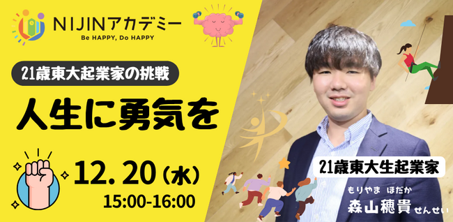 日本中の学校をハッピーにする株式会社NIJIN(本社:東京都江東区、代表取締役:星野達郎)が運営する小中学生向けオンラインスクール「NIJINアカデミー」は、このたび、東京大学の現役学生で株式会社emomeを立ち上げた森山穂貴氏をお招きし、オンライン特別授業を開催します。