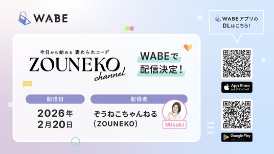 日本におけるライブコマースのインフラ化を目指す株式会社Cellest(本社:大阪府大阪市、代表取締役CEO:佐々木宏志、以下当社)は、ライブコマース専用ECモールアプリ「WABE(ウェイブ)」において、ライブコマース専門事務所「トキバナ」が運営する月商2億円超の国内最大級のライブコマースチャンネル「ぞうねこちゃんねる」の配信を、2026年2月20日(金)12:00より実施することをお知らせいたします。