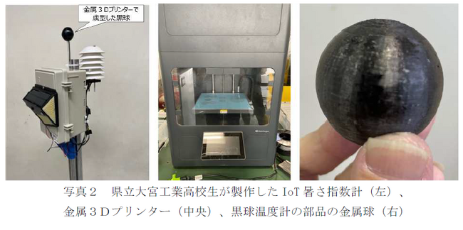 今年度は、昨年度のデータ解析授業で明らかになった、強風時の黒球温度計の観測精度の課題を解決するために、同校が所有する金属3Dプリンターを利用して、黒球温度計の部品をピンポン球から金属球に改良し、従来より精度の高いIoT 暑さ指数計を製作できました(写真2)。