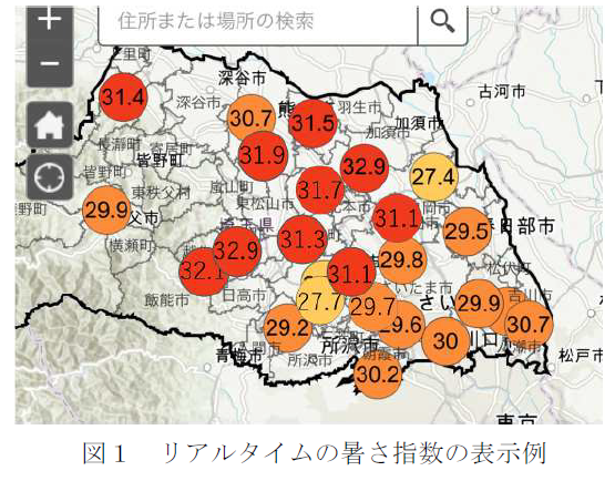 県立高等学校等県内24地点に設置したIoT 暑さ指数計の測定結果を集約し、埼玉県気候変動適応センターのウェブサイト(※2)でリアルタイムの暑さ指数を見ることができます(図1)。