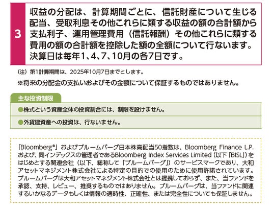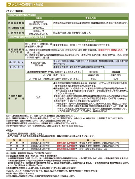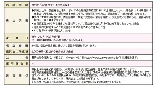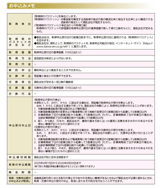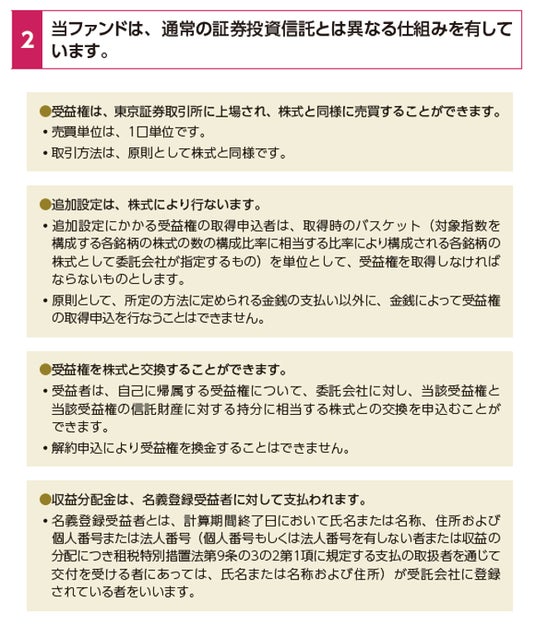 - 株式または金銭の拠出により当ファンドの取得(応募、追加設定)をご希望の場合には投資信託説明書(交付目論見書)を販売会社(指定参加者)よりお渡しいたしますので、必ず内容をご確認ください。