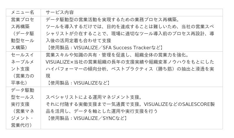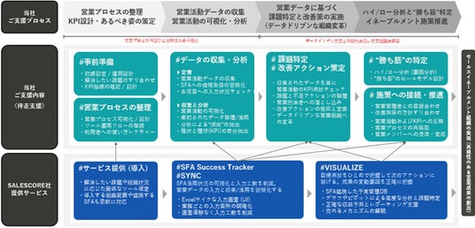 本サービスは、「SFAを導入できていない」「SFAを導入しているが定着せず、必要なデータを蓄積できていない」「データの分析や利活用ができていない」などの課題を抱える企業を対象に、両社の強みを活かした『データ駆動型の営業組織変革サービス』を提供します。営業組織における課題整理などのコンサルティングから「SALESCORE」の各プロダクトの導入・運用支援(データを軸としたハイパフォーマー分析、ナレッジ定着化、業務設計など)、その後の商談から受注獲得までの一連の流れを、データを活用して支援いたします。これにより、データを軸とした営業戦略・営業活動の実現とデータ駆動型の営業組織への変革を促し、成果を創出します。