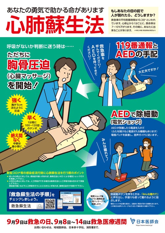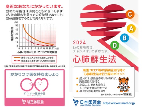 日本医師会では、毎年、救急蘇生について知ってもらうことで一人も多くの生命を救いたいとの思いから、「救急の日」ポスター並びに「大切ないのちを救う心肺蘇生法CAB+D」(CABDカード)を作成していますが、本年度も救急の日(9月9日)、救急医療週間(本年度は9月8日~9月14日)に合わせて作成し、日本医師会ホームページ内の「日本医師会救急蘇生法のページ」で公開を始めました。