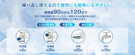 液状化しても涼しい環境に置くだけで再び凍り、繰り返し使用が可能です。環境にも優しく、財布にも負担をかけません。