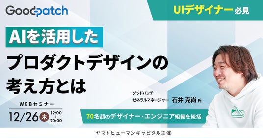 ヤマトヒューマンキャピタル株式会社(本社:東京都千代田区、代表取締役:堀江 大介)は、2024年12月26日(木) 19:00よりオンラインにて、株式会社グッドパッチ ゼネラルマネージャー 石井 克尚氏にご登壇いただくウェビナー『AIを活用したプロダクトデザインの考え方とは』を開催いたします。