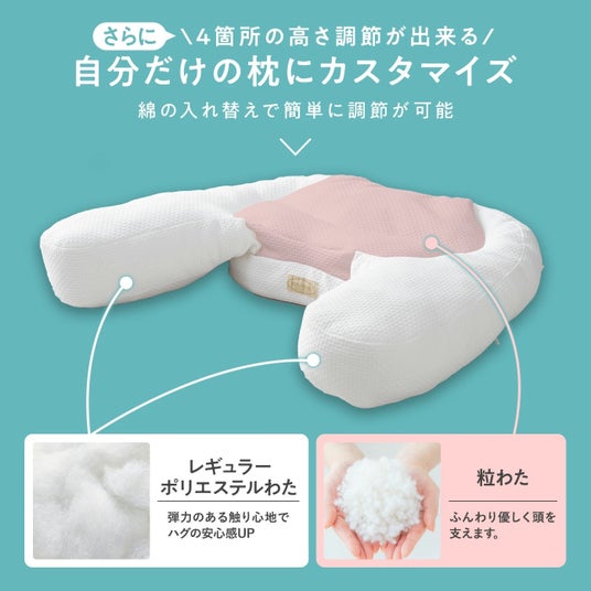 後頭部の部分にはふんわりと優しく頭を支える粒状のわたを使用し、両サイドのハグする部分には弾力のある触り心地のポリエステルわたを使っています。