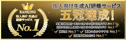 ホリエモンAI学校株式会社(本社:東京都新宿区、代表取締役CEO:荒木 賢二郎 、以下「当社」)は、株式会社未来トレンド研究機構が実施した「法人向け生成AI研修サービス」に関する市場調査〈No.1検証調査〉(2025年11月10日時点)において、5部門で No.1(※)を獲得しました。