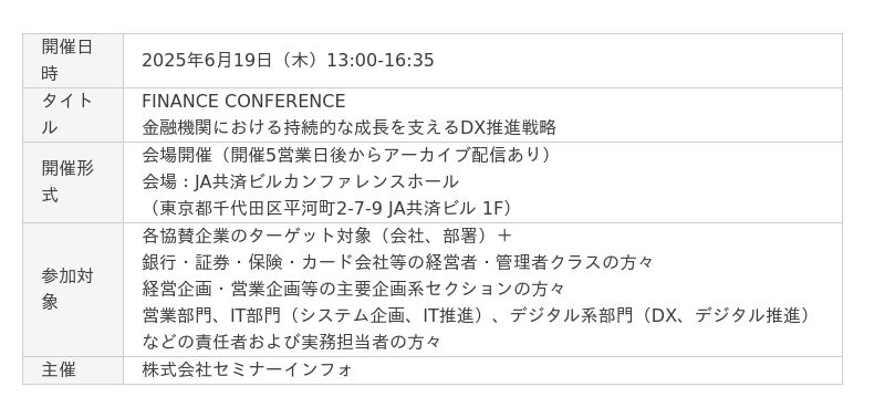株式会社セミナーインフォ(本社:東京都千代田区 代表:小西 亘)は、2025年6月19日(木)にFINANCE CONFERENCE「金融機関における持続的な成長を支えるDX推進戦略」を開催することとなりました。