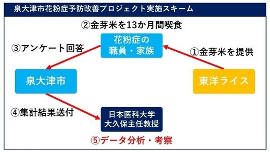 本プロジェクトでは、花粉症の症状がある泉大津市の職員とその家族を対象に約13か月間金芽米を食べてもらい、金芽米の喫食前後における花粉症の症状を検証します。