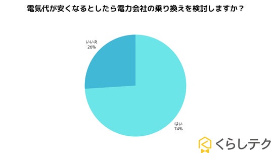 電気代が安くなるなら74.0%の人が電力会社の乗り換えに前向き